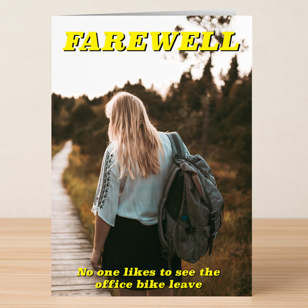 Make goodbyes less bitter with our Office Bike Insulting Farewell Card. This unique greeting card combines humor and sass (without being too rude) to make your farewells a little more entertaining. Perfect for those leaving on not-so-great terms. Leave your mark with a giggle (or maybe even an eye roll) with this one-of-a-kind goodbye card.