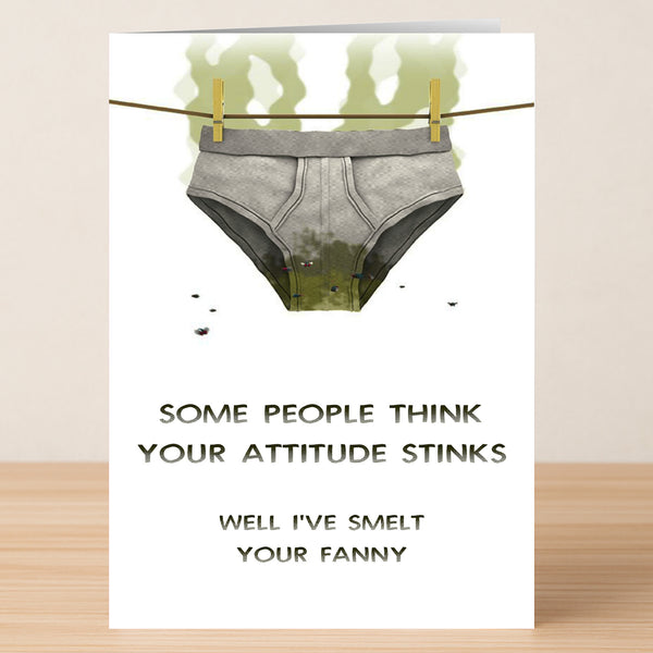 Expertly designed to bring a smile to anyone's face, the Attitude Fanny Insulting Greeting Card is the perfect way to show your sense of humor. With its witty and clever design, this funny greeting card is sure to brighten up anyone's day.