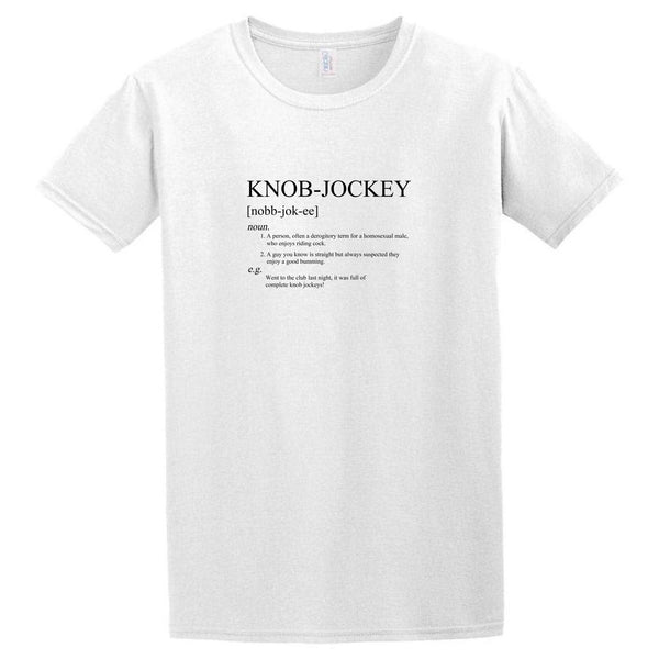 Get your hands on the Knob-Jockey T-Shirt and show off your playful side! This rude t-shirt is sure to turn heads and make a statement. Perfect for those who like to add a touch of humor to their wardrobe. (Warning: may cause laughter and eye-rolls.)