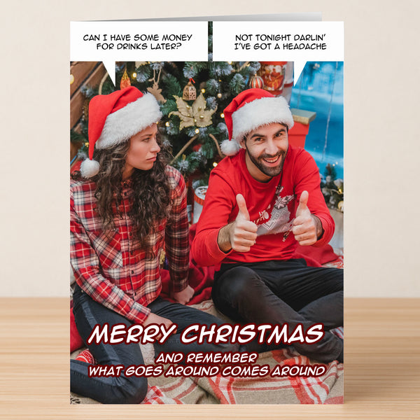 Spread some holiday cheer with our What Goes Around funny Christmas card! This quirky and playful card features a double meaning, perfect for someone who doesn't take themselves too seriously. Let them know that what goes around, comes around (especially during the holidays). Send some joy with this unique and humorous card.